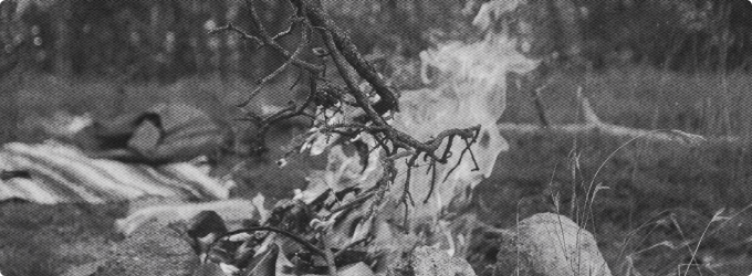 <p>Небольшая поляна, где двуногие иногда разбивают свои временные жилища. Здесь стоит обугленное кострище, вокруг него — поваленные деревья и пни, служащие сиденьями, а чуть поодаль можно найти странные цветные тряпки и забытые вещи — блестящие банки, верёвки, иногда даже куски еды: после их ухода здесь ещё долго пахнет дымом и чем-то едким, а вороны растаскивают оставленные крошки.</p>